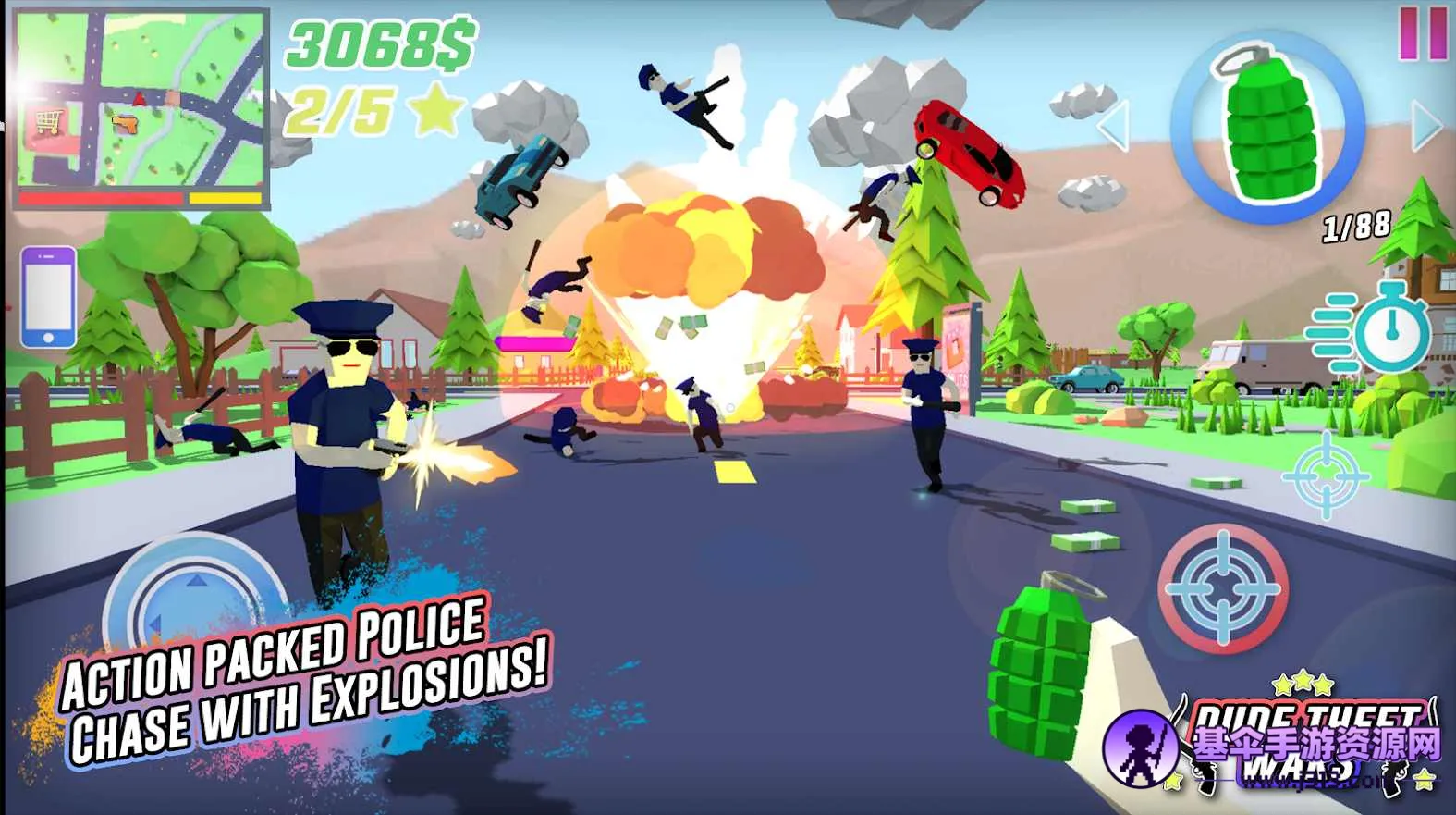 游戏里,你能通过多种方式赚钱,比如捡钱、偷钱,玩迷你游戏和做特技等,然后去商店买武器和炸药。以第一人称视角体验,用左侧摇杆控制角色移动,点击手的图标换物品,还能随时保存游戏。