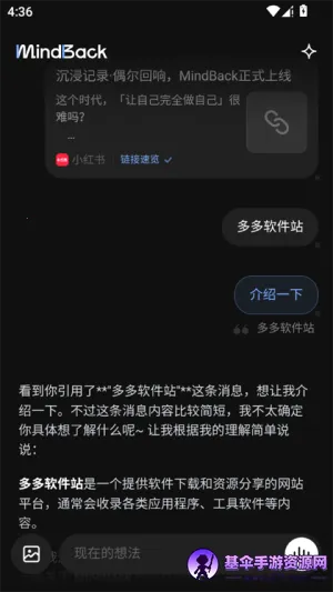 你是否想知道“mindback”是什么意思?别担心,有一款超棒的应用能帮到你!MindBack是一款专为日常记录与灵感捕捉设计的AI辅助记录与记忆管理应用。它支持文字、语音、图片、链接等多种形式快速输入,无需复杂分类或标签系统。在这里,你可以像聊天一样轻松记录灵感想法与生活瞬间,毫无压力。系统还会自动串联零散记录,比如把旅行照片汇成影片,整理文章链接成可阅读清单。内置AI助手能回答与历史记录相关的问题。它能解决记完内容保存失败、语音转文字不准、搜关键词找不到对应记录、APP闪退卡死等问题。比如保存失败可检查手机存储等;语音转文字不准,放慢语速或手动修改就行。而且它功能强大,能自动生成网页链接或文章摘要,还有生活节奏可视化功能。总之,MindBack能帮你轻松管理个人信息和回忆,强烈推荐给习惯随手记录的你!