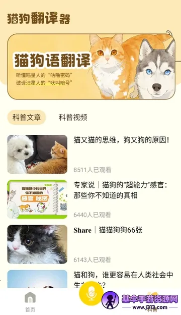 2、详细使用教程:配有详细教程,帮你快速上手,打开app点击同意隐私政策,进入首页即可使用各种功能逗毛孩子,点击语音可录入人声猫声等翻译,点击科普能学习猫狗知识。
