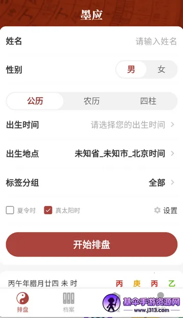 2、进入软件排盘页面,输入你的基本信息即可开始排盘