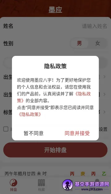 1、打开墨应八字app,点击同意隐私政策