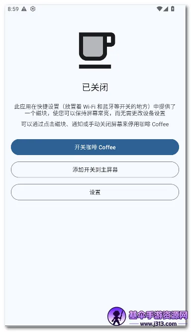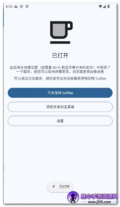咖啡Coffee安卓应用能让屏幕常亮,无需改设备设置。可在快速设置板块、应用内按钮等多处切换功能,需Android7或更高版本,还能设为辅助应用,可能因电池保护模式故障,可启用备用模式。