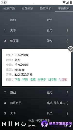 这个音乐库搭载超强多引擎精准搜索技术,能快速抓取全网热门流行曲目、影视原声、动漫歌曲、小众精品等各类音乐资源。只需输入歌手名、歌曲名或专辑名称,就能快速找到想听的音乐,不会错过任何一首好歌。它支持在线与离线播放,还有多种音质选项,满足你对音质的高要求。能根据听歌记录和偏好,智能推荐个性化的歌曲和歌单,无论你喜欢流行、摇滚、民谣还是古典音乐,都能找到心头好。此外,还有音乐杂志、场景音乐、智能场景推荐和精选歌单等丰富内容。下载歌曲也很简单,点击歌曲后面的三个点,选择下载选项,确定下载方式,等待完成即可。快来体验吧!