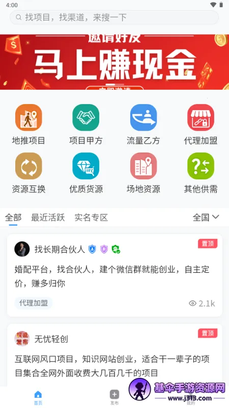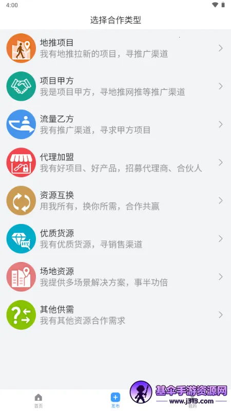 4、类型多样:发布类型丰富,包括地推项目、项目甲方、流量乙方、代理加盟、资源互换等多种,合作方式和乙方渠道也众多,能全方位满足需求。