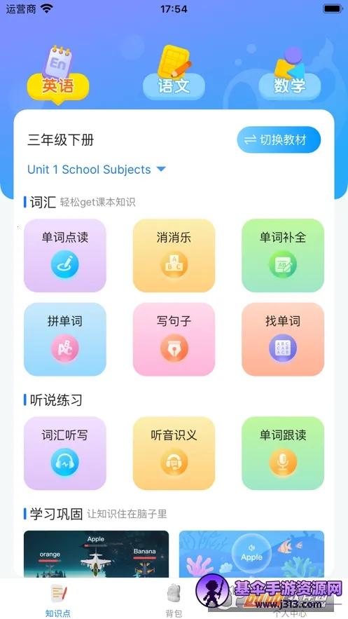 3、进入学科知识点页面点击学科选择需要学习的科目,即可使用各类学习功能。