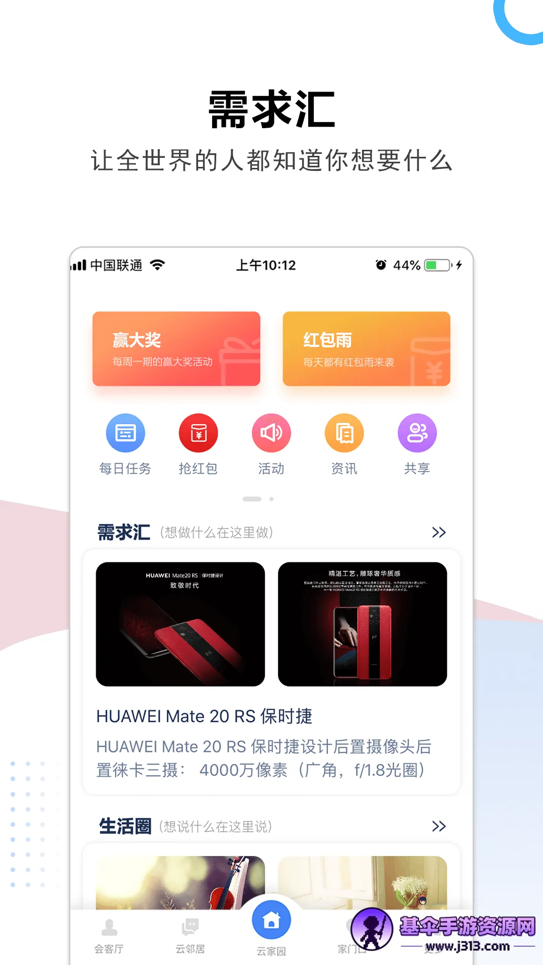 云家园软件能满足多种生活需求,超实用!它有发布需求功能,能详细编辑生活需求信息并一键发布,比如租房、找服务等需求都能快速传达。需求汇里能查看所有用户需求,方便供需对接交流。房屋出租板块能让你轻松查找感兴趣的房源进行租赁交易。订座吃饭服务可帮你查找附近餐厅并订座下单。家邻居功能能在线添加管理家人好友,方便即时通讯交流。它的特色众多,便捷生活,各种服务让生活更便利;能轻松赚钱,在需求汇中提供帮助就能赚钱;生活圈有精彩动态;找房租房快捷;服务多元化;社交互动轻松。总之,云家园是个能解决生活诸多问题,带来极大便利的综合性服务平台,值得下载使用。