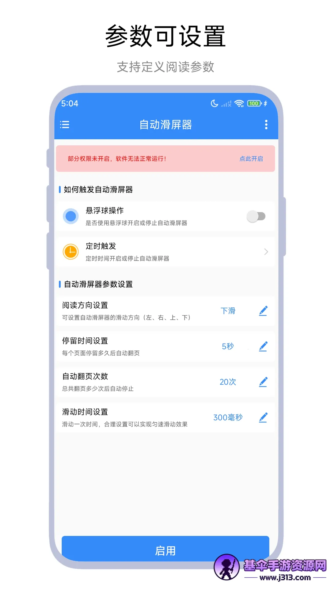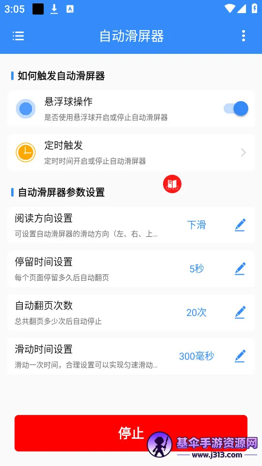自动滑屏器是一款超实用的辅助工具。它能解放你的双手,在各种阅读场景中,无需手动滑动翻页,只需阅览手机屏幕就行。软件里有丰富动作预设可设置,能打造舒适阅读环境。它功能强大,能流畅拖拽内容,平滑缩放页面图像,左右滑动屏、上下滚动列表都很流畅,软件启动和内容读取速度也快。使用时,下载安装后打开,首次需自定义开启权限,然后设置好参数点击启用,能自定义滑动方式、停留时间、自动翻页次数等,还能修改悬浮球大小和透明度。界面简洁易懂,操作方便,功能齐全能满足各种滑动需求,兼容多数安卓和iOS设备。要说自动滑屏器会封号吗,其实正常使用一般不会。它只是辅助你更便捷地操作手机,只要不用于违规行为,就不用担心被封。有了它,阅读、浏览等都轻松不少,快来下载体验吧。