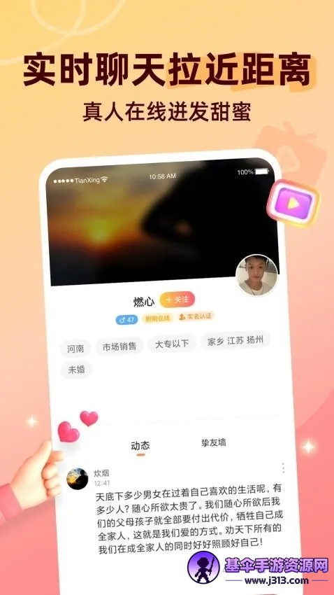 这款交友软件有其独特之处。它汇聚了丰富多样的短视频,涵盖生活美学、情感故事等多种类型,输入关键字就能查找喜欢的内容。其一大亮点是内容调性统一,专注温暖治愈正能量,社区氛围友好和谐。视频制作精良,画面清新、配乐悦耳,观看体验舒适放松。云播放模式能链接网络资源库搜索电影,所有视频资源免费观看、任意点播还能下载缓存。用户可按偏好筛选感兴趣的异性,贴合真实社交需求。在功能方面也较为全面,分类详细精准,影视观看随时可进行,资源应有尽有,首页还会推送精彩视频。优势在于有沉浸式自然场景频道、交互式正念练习课程,播放质量高且实时更新。通过畅聊互动、告别单身、动态互动和消息交流等方式,助力用户增进情感交流,邂逅心动。