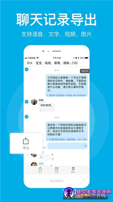 2、便捷聊天功能:基础单聊群聊齐全,支持发文字、表情、图片、语音、视频等,聊天记录可转发,语音也能轻松分享。