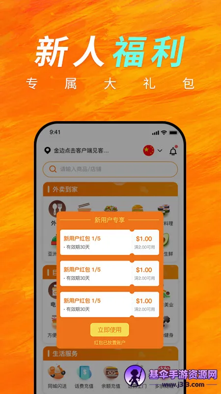 优质服务有保障:专业配送团队,提供极速配送,超时赔付。甄选优质商家,确保食品安全。新人有 5 美金大额红包,还有准时保服务。