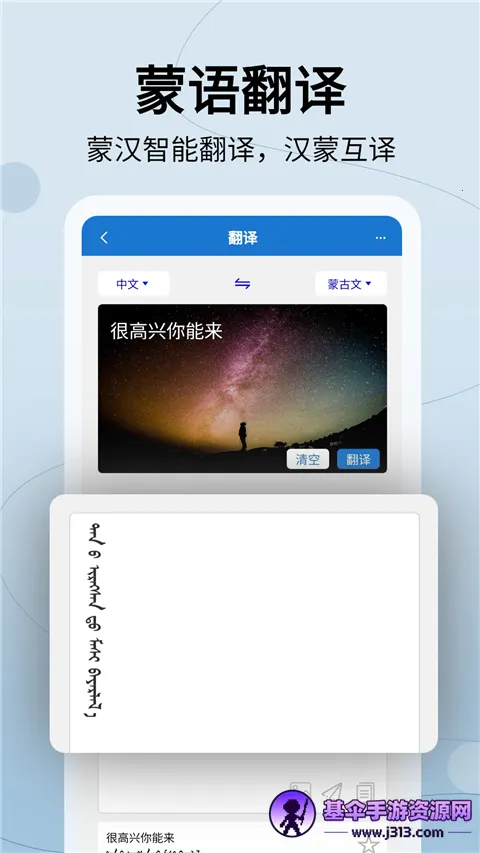 蒙汉翻译通app是智能翻译工具,支持蒙汉互译及多种语言翻译。有海量词汇、离线翻译等功能,界面简洁,支持多种输入方式,还有人工翻译、收藏功能等,适用于多种场景,方便蒙汉交流与学习。