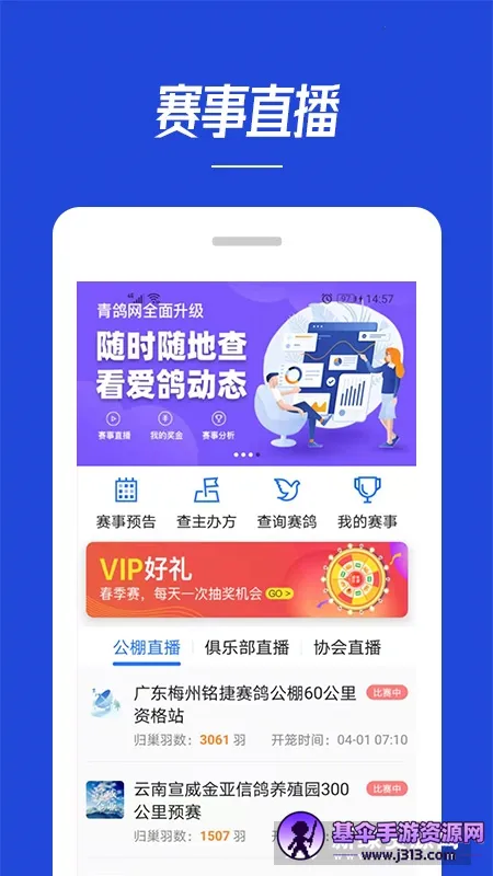 青鸽网2026官方正版是一款专注信鸽领域的安卓应用。提供丰富赛鸽资讯、赛事直播,还有成绩查询、财务管理等功能。能发布供求,一键关注供应商微博,定位城市找本地资源,满足养鸽爱好者多样需求。