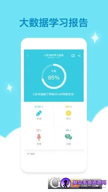 软件特色众多,大数据学习报告定期推送,多维度分析孩子兴趣;点读笔跟读评测可实时打分回放英语跟读音频,分析学习情况;点读笔游戏能查看结果与疑难;伴读宝AI翻读绘本,家里绘本翻开即读;还有海量有声书籍拓展孩子阅读兴趣。