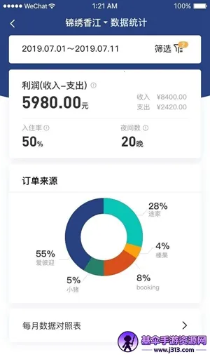 民宿经营数据可视化:聚合多渠道运营和财务数据,按日期统计经营收入、入住率等多项指标,自动生成可视化图表,助房东对比判断各渠道价值,自主决策,把控房态房价。