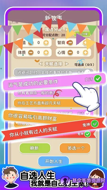 人生轨迹模拟器是一款超好玩的人生模拟游戏!从婴儿期开始,经历各阶段成长,体验别样人生。你能自由选家庭背景、职业、人际关系等。这里有实用攻略:开局属性分配很关键,建议颜值6点、智商4点、体质6点、家境4点,助你轻松活到100岁。生娃要瞅准时机,结合经济和身体状况。选职业得留意属性要求,像灵媒职业适合喜欢特殊体验的玩家。遇到卡顿,可点击成就剧情城镇系统继续。要是家庭成员啃老,安排去咖啡店打工改善。赚钱也有门道,选喜欢的家人,弄vip免视频讨好父母,选专业对口工作,相亲看准对方喜好送礼,四十岁后要一胎,独生子女可继承遗产,还能买房增值。总之,能让你体验多样人生,快来试试吧!
