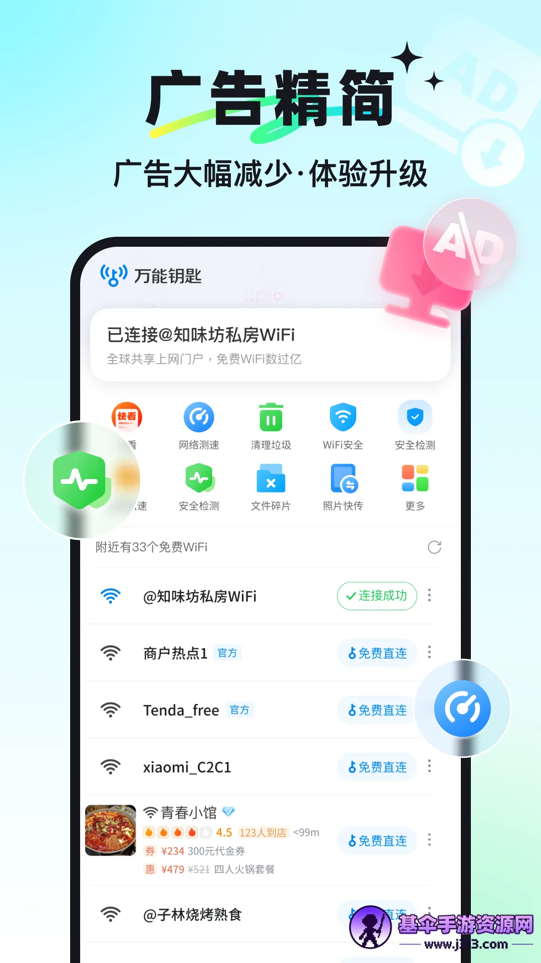 万能钥匙wifi自动连接不需密码免费下载五星!它是一款超棒的应用软件。拥有先进的WIFI网络辅助工具,能满足多场景需求,助你快速接入安全热点。还有广告精简工具,大幅减少广告。具备安全的网络隐私保护,防止隐私外泄。覆盖全国海量热点,自动优选高速网络,追剧游戏刷视频超流畅。软件界面简洁,操作流畅,轻松上手。来本站即可免费下载体验,享受便捷上网,五星推荐!