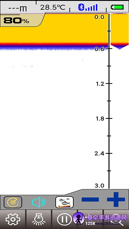 **界面与操作**:主页面可查看探测深度、电量、水温与蓝牙连接状态,界面简洁易用。点击鱼符图标能切换显示模式,点击圆形按钮图标可选择深度范围。