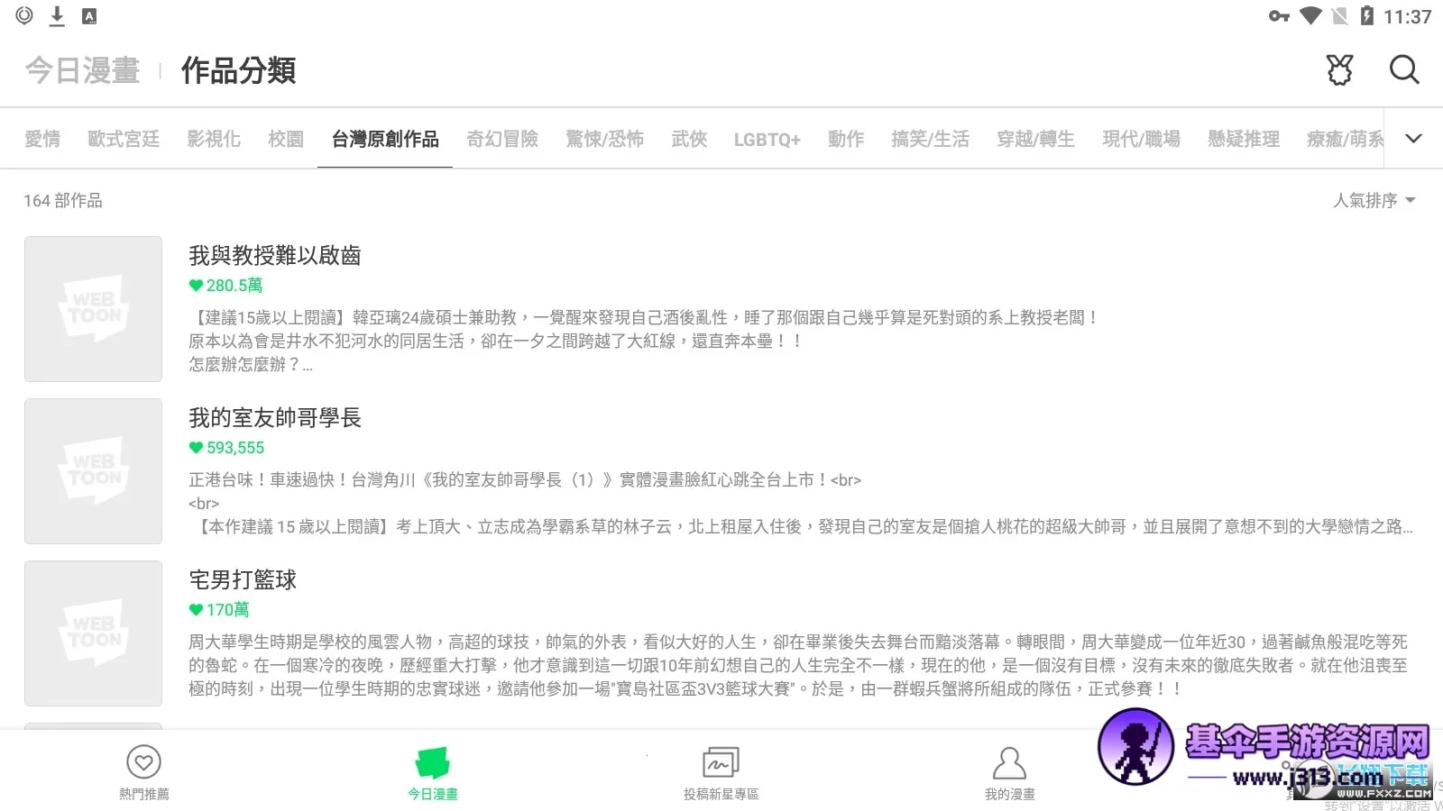 Webtoon是韩国NAVER旗下漫画阅读平台,涵盖丰富类型,高清全彩,有繁体中文。分类详细、更新及时,有独家资源,可发弹幕、自定义阅读。能下载离线观看,还有社群功能、更新提醒,创作者可展示才华。