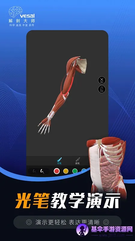 解剖大师app是一款超棒的医学解剖学习工具。它基于可视化三维技术,有高精度3D模型,能清晰展现人体肌肉、骨骼等结构形态和位置关系。支持对部位旋转、缩放、分层观察。笔功能超实用,光笔指示模型位置且画过快速消失,画笔能在平面绘画并保留笔迹,3D画笔可在模型表面标记。软件特色满满,有全面人体解剖资源,涵盖超15000个模型;支持多维互动操作,能自主编辑图谱与笔记;临床级解剖模型高度还原真实细节;还有微观结构三维可视化。优势众多,集成资源库方便检索定位,有三大互动动画资源库,支持自由脊柱调节、图像转3D、姿势评估等功能,3D模型还支持AR学习模式,简直就是便携式康复医学百科全书,能极大满足医学相关人士学习需求,助力轻松掌握人体知识。
