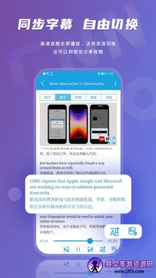 3. 支持离线收听,可批量下载MP3和中英文字幕,节省流量。语音同步双语字幕单句循环强化听力,长按单词查词方便学习生词。