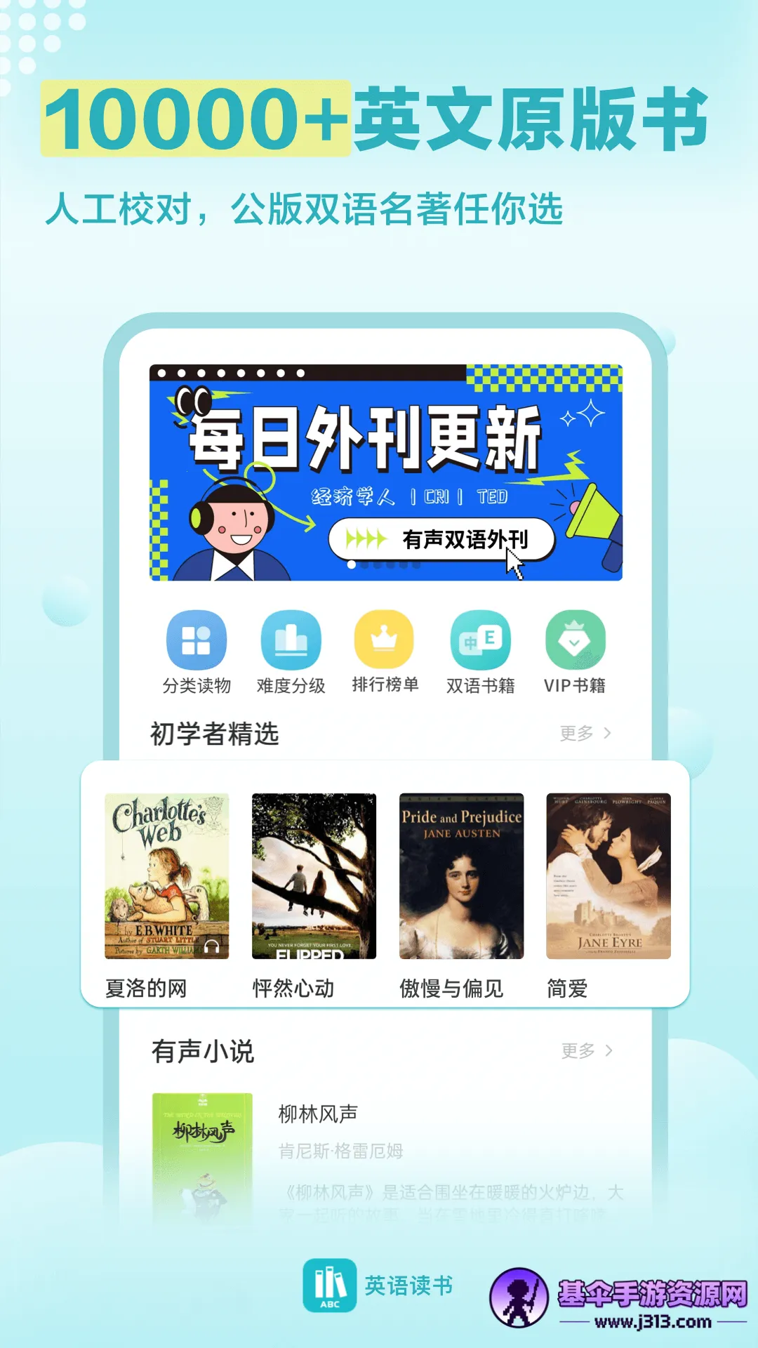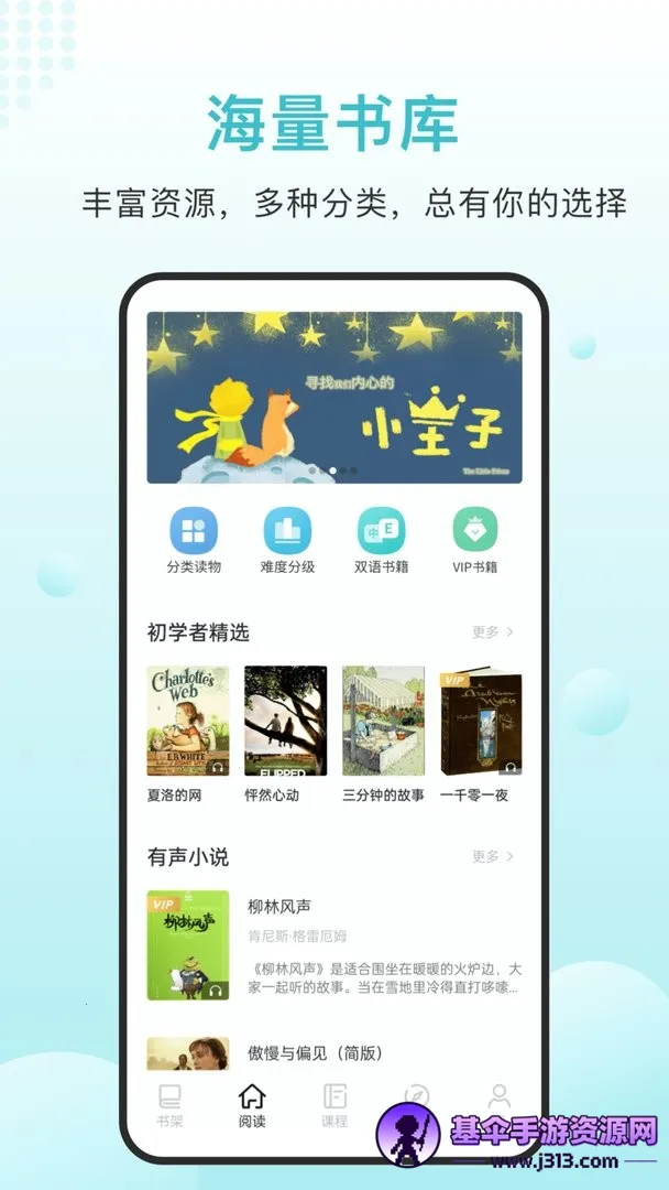 1. 海量丰富的图书资源,上万本英语图书涵盖人物传记、经典名著、书虫系列、儿童读物等各类题材,不管是新手还是大神都能找到合适读物。分类超齐全,满足不同学习需求。