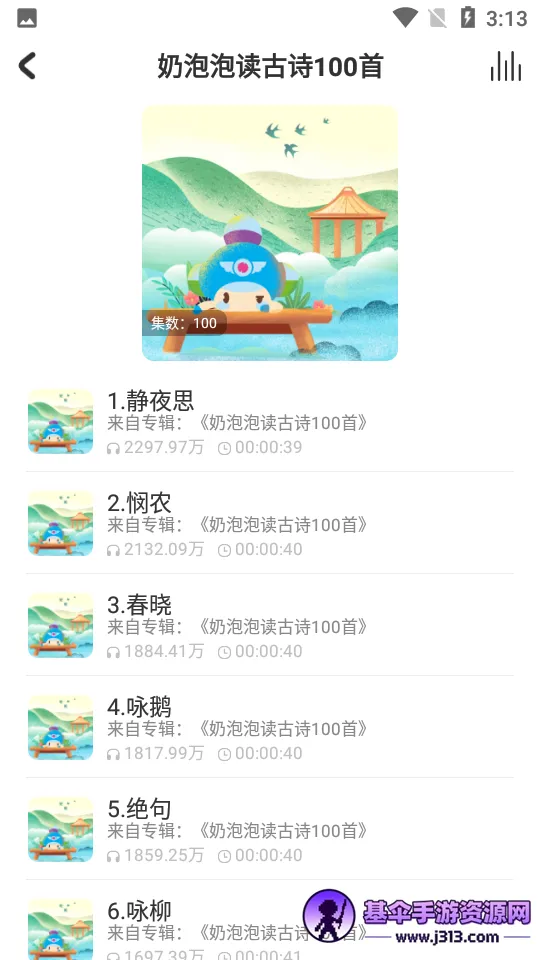 儿童学古诗2026官方正版是一款受0-12岁孩子喜爱的国学课程软件。邀请专业人士创作,以广播剧形式呈现,分角色演绎,爆笑有趣。有免费专区,搭配闯关游戏,还有超级IP奶泡泡,助力孩子轻松学古诗等国学知识。